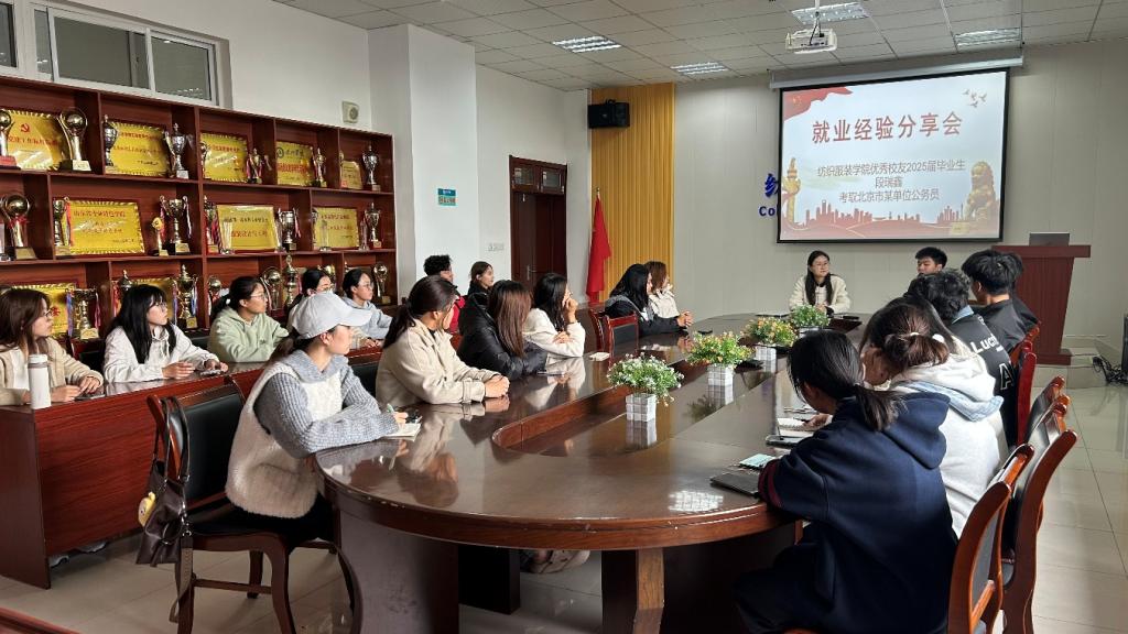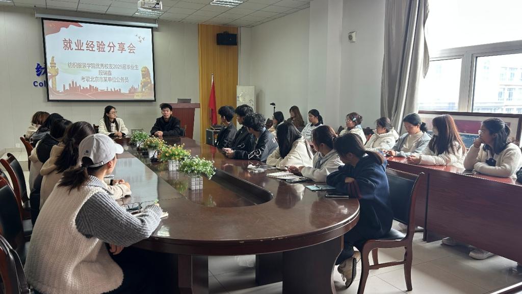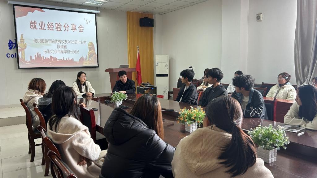 为进一步明确学生就业方向、提升就业竞争力,充分发挥优秀校友的榜样示范与引领作用,10月19日上午,纺织服装学院在启智楼419会议室组织开展就业经验分享会。本次分享会特邀我院2025届优秀毕业生段瑞鑫主讲,学院辅导员及2023、2024、2025级共20余名学生参加。