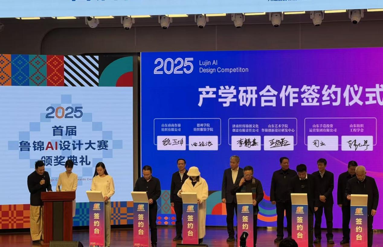 活动现场,纺织服装学院负责人与山东睿尚鲁锦纺织有限公司负责人签署产学研合作协议。此次签约是学院响应大赛“创意设计+数字技术+实体产业”协同发展理念的具体实践,标志着双方将在鲁锦创意设计、AI技术应用、人才联合培养、科研成果转化等方面开展深度合作,为学院学子搭建实践锻炼平台,也为鲁锦产业高质量发展注入新动力。