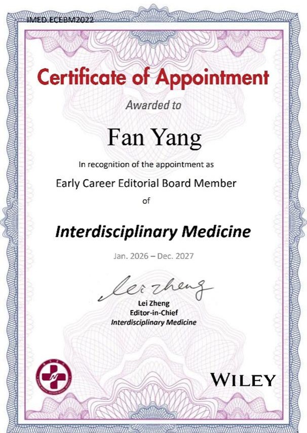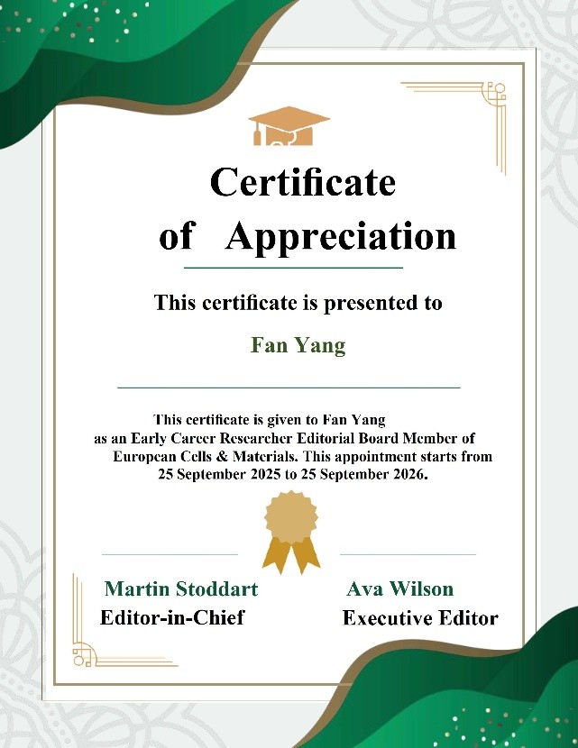 近日,纺织服装学院杨帆副教授受邀担任国际学术期刊Interdisciplinary Medicine与European Cells & Materials青年编委,标志着我院教师在相关交叉学科领域的学术影响力和国际认可度得到了进一步提升。