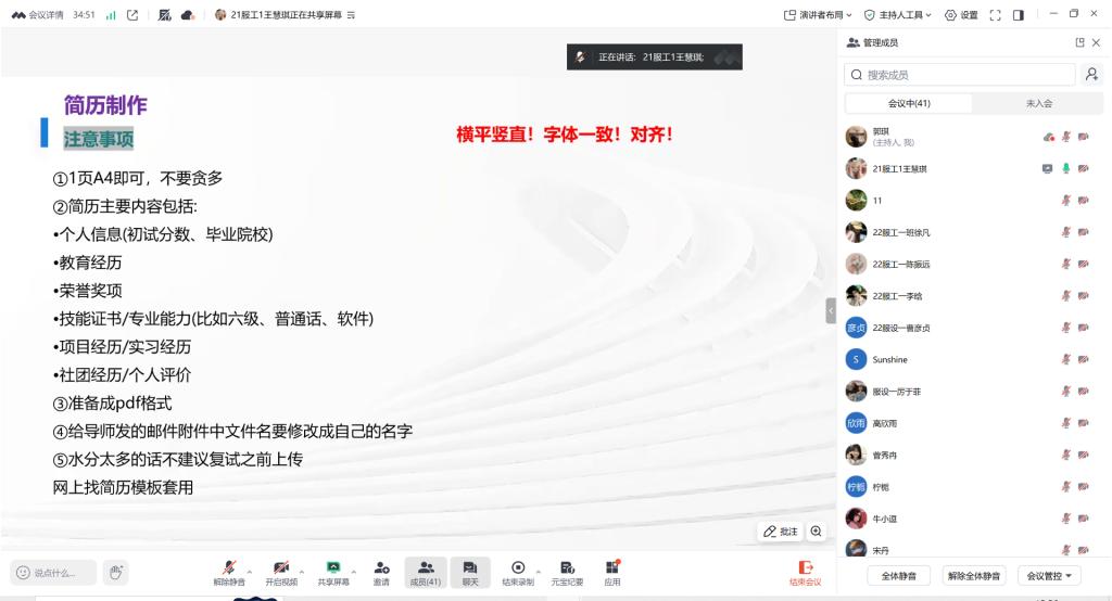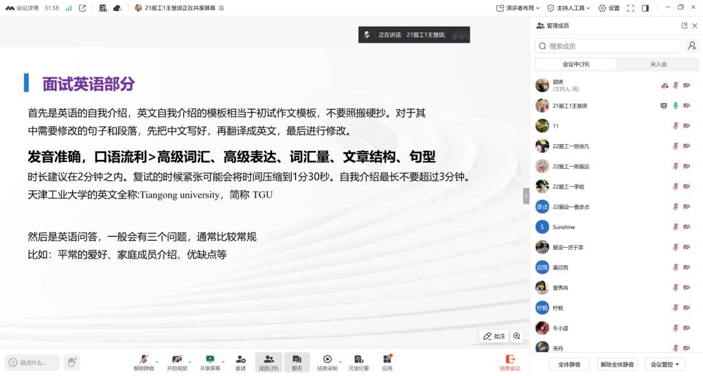 会上,考取天津工业大学的王慧琪同学围绕复试全流程进行了系统梳理。她详细介绍了天津工业大学复试的计分方式、笔试科目《服装工艺学》的备考内容与参考书目,并强调了复录比、面试时长等关键信息。在面试环节,她分享了英语自我介绍的准备技巧,建议时长控制在2分钟内;同时结合自身经历,列举了面试中可能遇到的专业课问题。她还特别提醒同学们注意细节礼仪、提前准备简历,并鼓励大家放平心态,沉着备考。