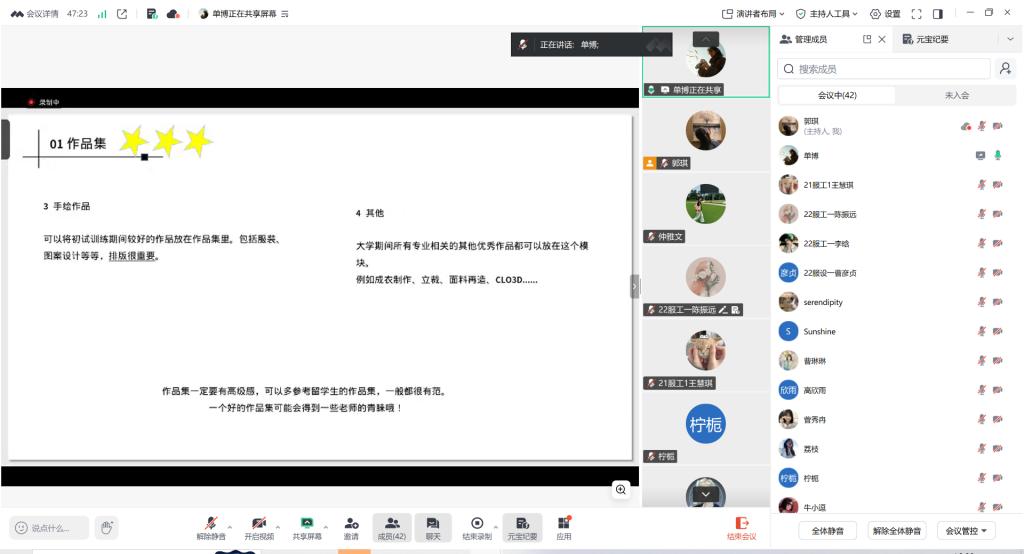 考取上海工程技术大学的单博同学则从复试科目、面试技巧、作品集准备三个方面展开分享。她介绍了该校复试包含命题设计和专业面试两大板块,强调面试中“随机应变”的重要性,建议同学们准备中英文两个版本的自我介绍,英文问答以简单句为主、确保流利开口。她特别指出作品集在复试中的关键作用,分享了自身作品集的构成、页数建议、打印数量及排版要点,并提醒所有作品务必保证原创性,并鼓励大家多参考优秀案例,打造具有高级感的作品集。