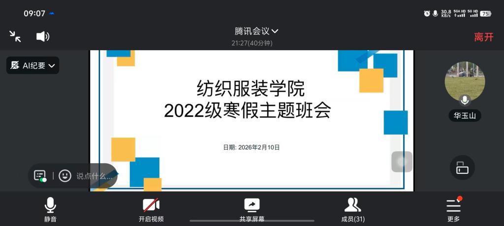 为了进一步增强学生学业规划意识与职业发展素养,引导同学们合理安排寒假生活、夯实学业基础、明确发展目标,2月9日至2月10日,纺织服装学院组织2022级学生召开线上寒假主题班会,我院党委副书记、辅导员及全体2022级学生参会。