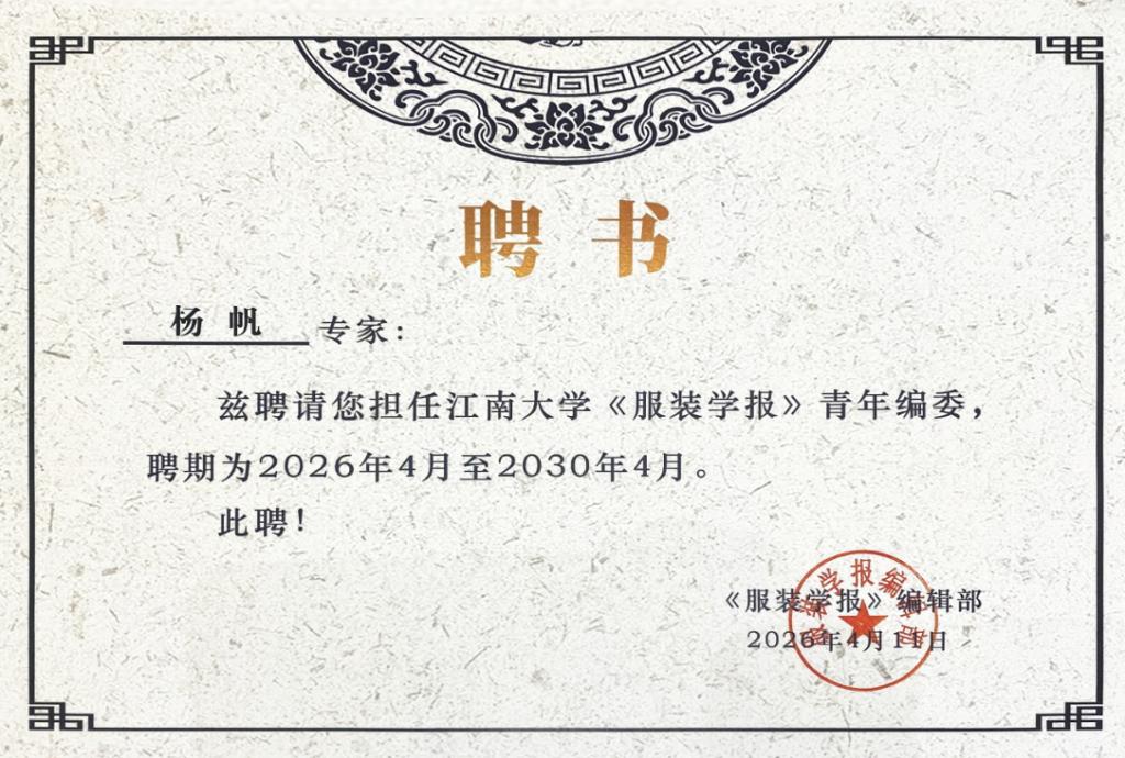 《服装学报》是由江南大学主办、国内纺织服装领域具有重要影响力的学术期刊,2023年入选中文核心期刊,跻身纺织科学技术Q1分区。期刊以“工程+艺术”交叉融合为特色,聚焦服装材料、服装工程、功能服装和服装设计这四个前沿领域。第一届青年编委会的成立,旨在凝聚青年学者智慧,为期刊发展注入新动能。杨帆老师的入选,标志着我校纺织服装学科青年骨干的学术活力得到了国内主流期刊的高度认可。