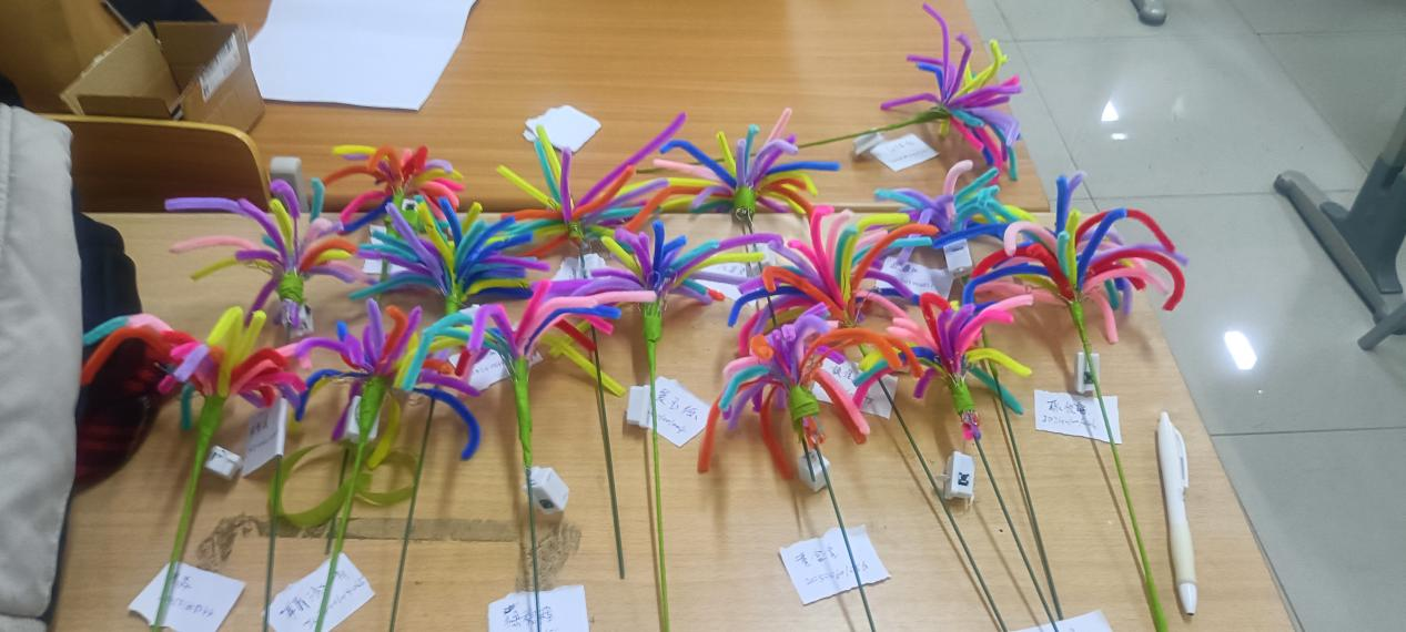 活动现场,色彩鲜艳的扭扭棒、金属杆、小灯串等材料整齐陈列,为同学们的创意发挥提供了充足支持。活动开始,同学们迅速投入状态,充分释放想象力与创造力。大家自由搭配黄、红、橙、蓝、粉等各色扭扭棒,以金属杆为基底,通过扭卷、缠绕、弯曲、拼接等多样手法,将柔软的扭扭棒塑造成形态各异的“烟花”造型。不少同学还巧妙融入个性化设计,嵌入小灯串赋予作品暖光氛围,让每一件“定格的烟火”都兼具观赏性与实用性。创作过程中,同学们相互交流思路、分享技巧,现场氛围热烈而温馨,处处洋溢着创意碰撞的火花。经过近两小时的精心制作,一件件色彩鲜艳、造型别致的扭扭棒烟花作品新鲜出炉。活动尾声,部分工艺精湛、创意独特的优秀作品被现场陈列,成为校园里一道充满童趣的风景线。