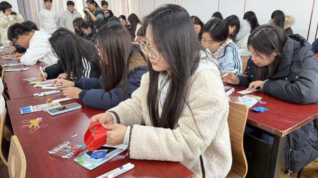 活动现场氛围热烈,各学院师生齐聚一堂,负责人系统讲解了科学防治艾滋病要点,呼吁大家塑造健康的生活方式,做到科学认知、主动防范、友善包容。在文艺表演环节中,幽默又深刻的防艾主题小品引发全场共鸣,同学们用嘹亮的歌声传递关爱与担当,让防艾理念在艺术熏陶中深入人心。在互动环节中,志愿者们带领大家开展制作红丝带活动,讲解了红丝带象征关爱与支持的深刻内涵,参加者亲手佩戴践行承诺,传递防艾正能量。同时,参加者们现场进行了创意书签绘制,将艾滋病传播途径、防护措施等科学知识,与红丝带、爱心等抗艾象征元素巧妙结合,勾勒出一张张设计新颖、内容丰富的防艾主题书签。